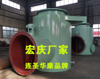 4、分匯器是一個三通閥,通過導向板的切換可使膠球進入需要清洗的一側(cè)凝汽器中工作。一般一臺機組需兩臺分匯器,其進口通徑為DN100,分配口為DN89,膠球投用時可通過窺視窗觀察運行情況。FH型分匯器(清潔海綿膠球切換三通管閥)